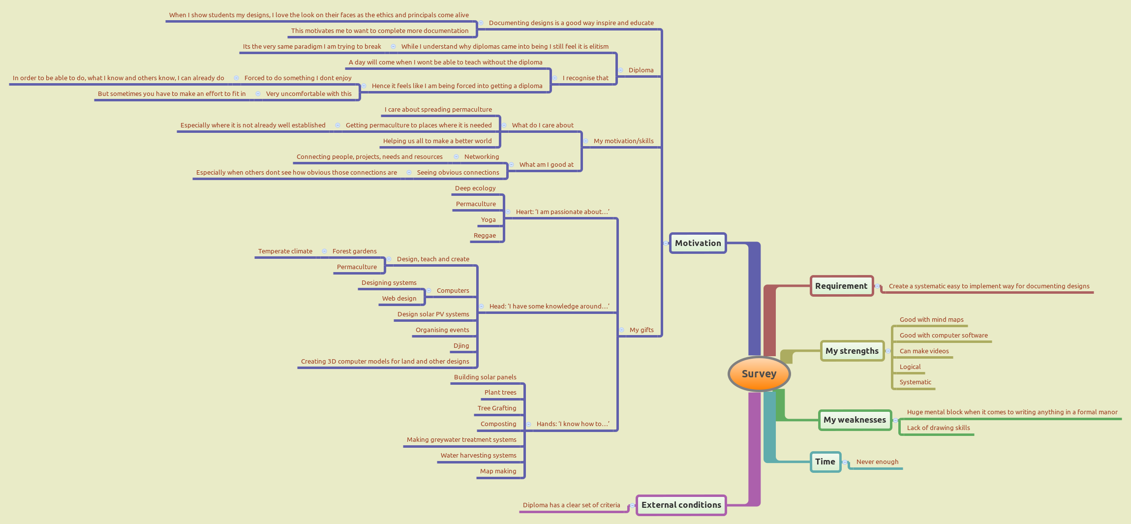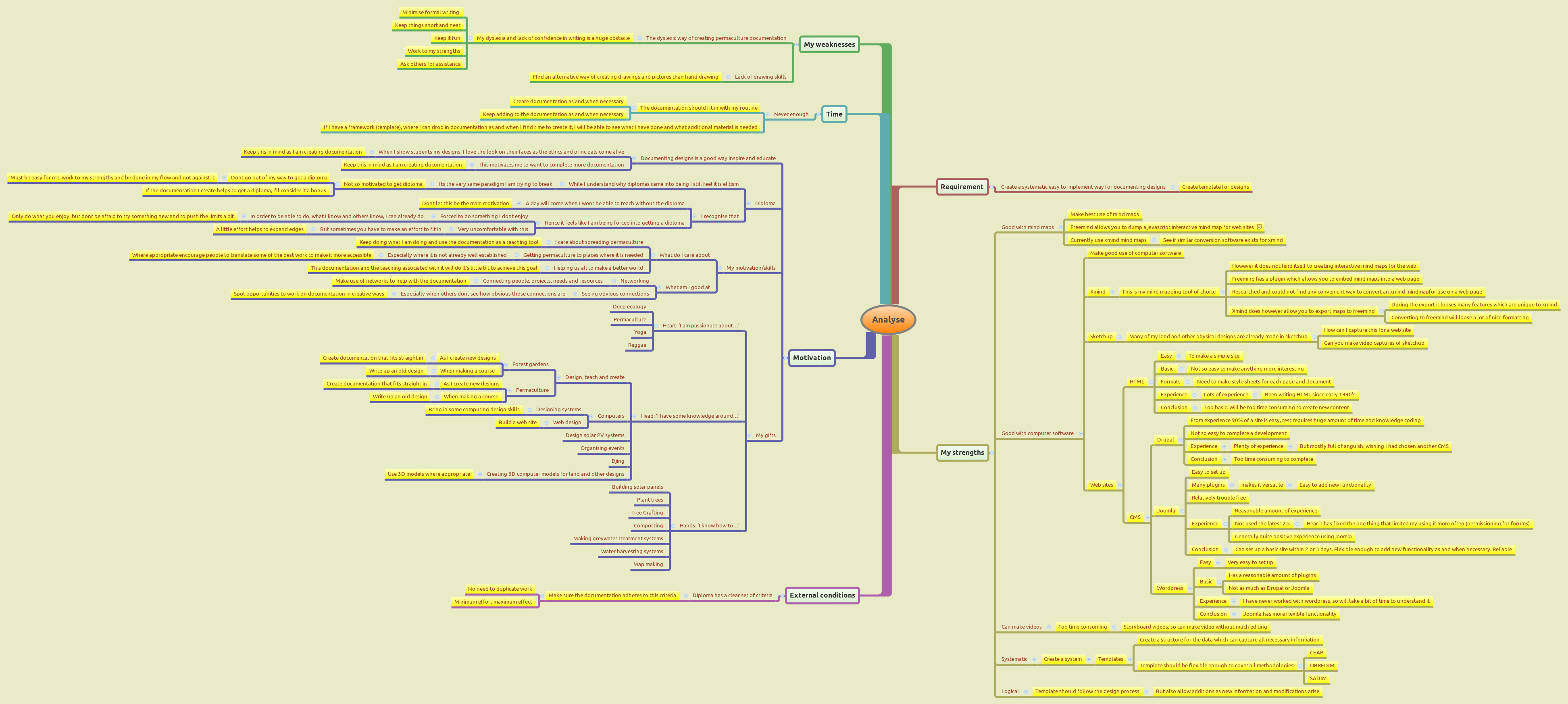 This section includes the detailed mind maps where I explore the analysis work. As in the survey section, I have included an explorable freemind mind map as well as a static image of the original xmind mind map. In the original xmind mind map you can see how I have taken information from the survey and added comments, which I have highlighted in yellow.