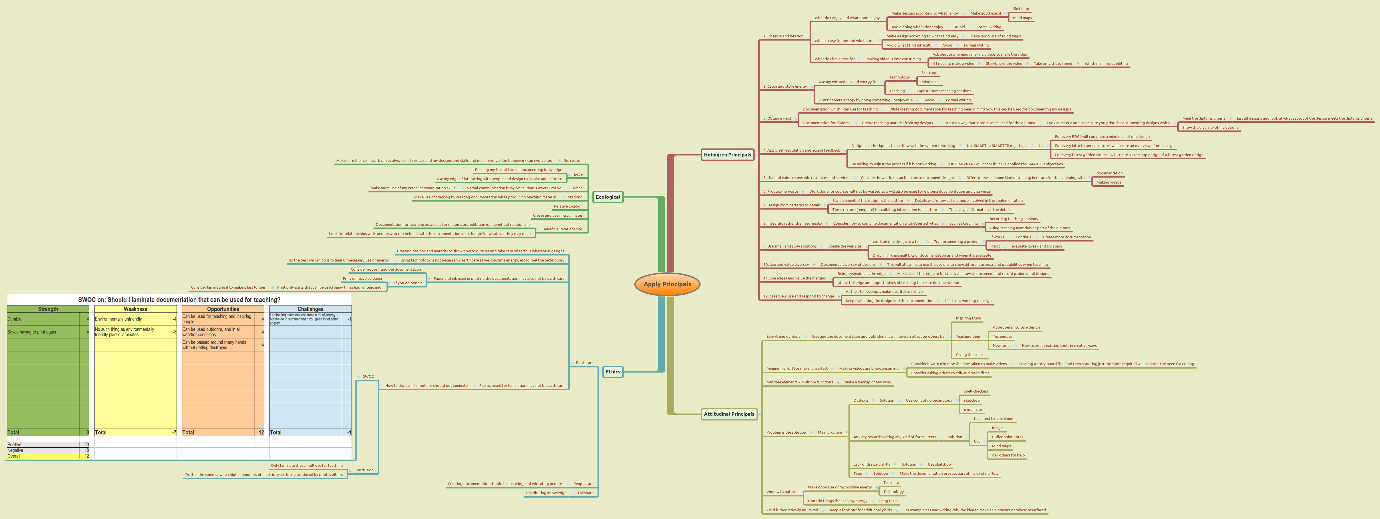 As well as applying the principles to the design, I also keep looking at the ethics. One area that stuck out for me about the ethics is how printing deigns for the sake of printing is not in any way earthcare. So my conclusion was to only print what I knew I would use for teaching. I then thought about resilience, and how I can make the printed copies last as long as possible and make them usable in any scenario or any weather conditions. Laminating was the obvious answer, however the laminating machines and the plastic are also not earthcare. So I used the SWOC tool to make a decision on whether the benefits outweigh the negative side. I also concluded I should laminate in the summer when I know I can generate enough solar power to drive the laminating machine.