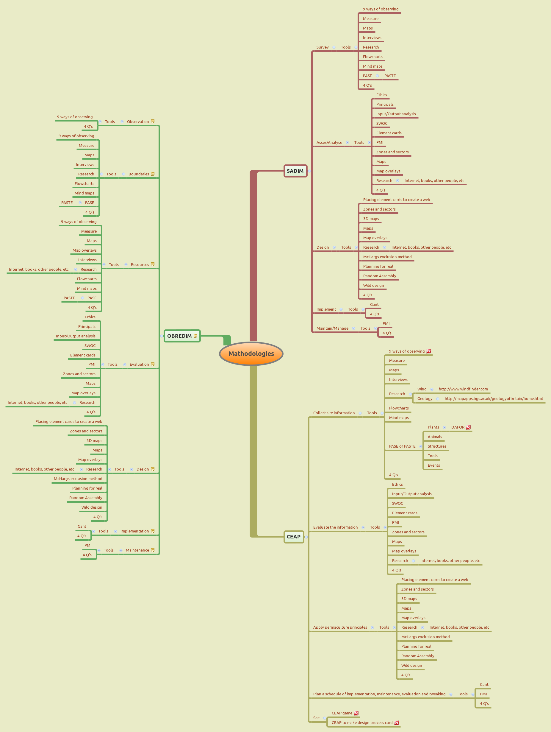 As explained above, this mind map is one of the sub-branches of the previous mind maps on Elements in the design. It lists the three main methodologies I use, including all the tools that can be used at each stage of each part of the methodology.