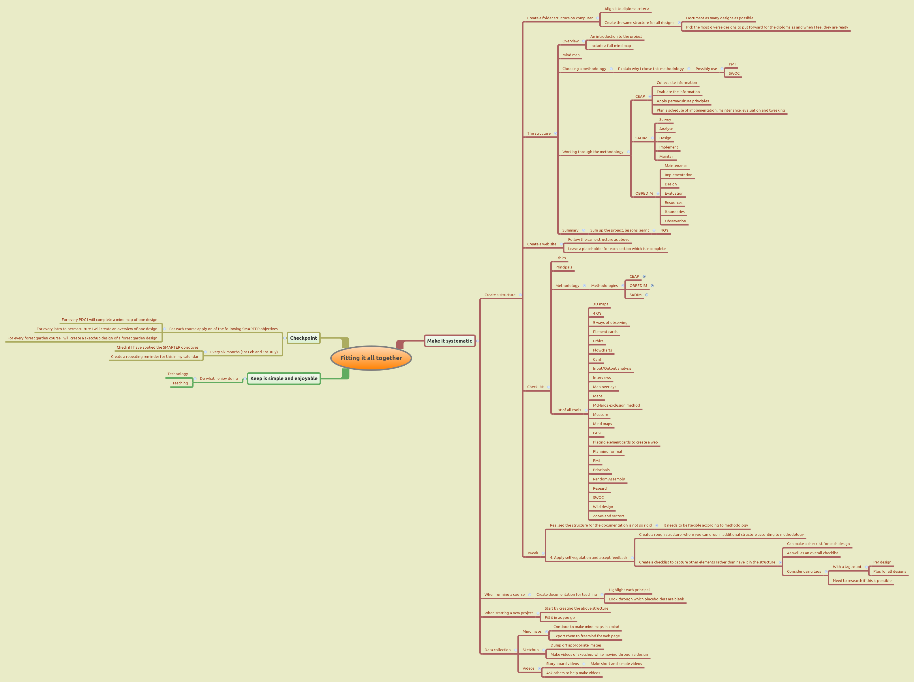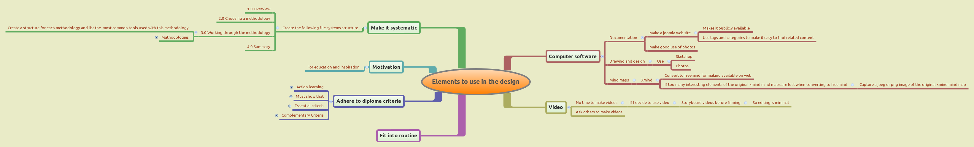 Here I list some of the key elements in this design. You will notice under "Make it systematic", "Create the following file system structure", "3.0 Work through the methodology", the "Methodologies" section has been collapsed (denoted by a + sign surrounded by a circle). That is because this section was too large to print on on mind map. I have therefore included it below as a separate image. The same goes for "Adhere to the diploma criteria"