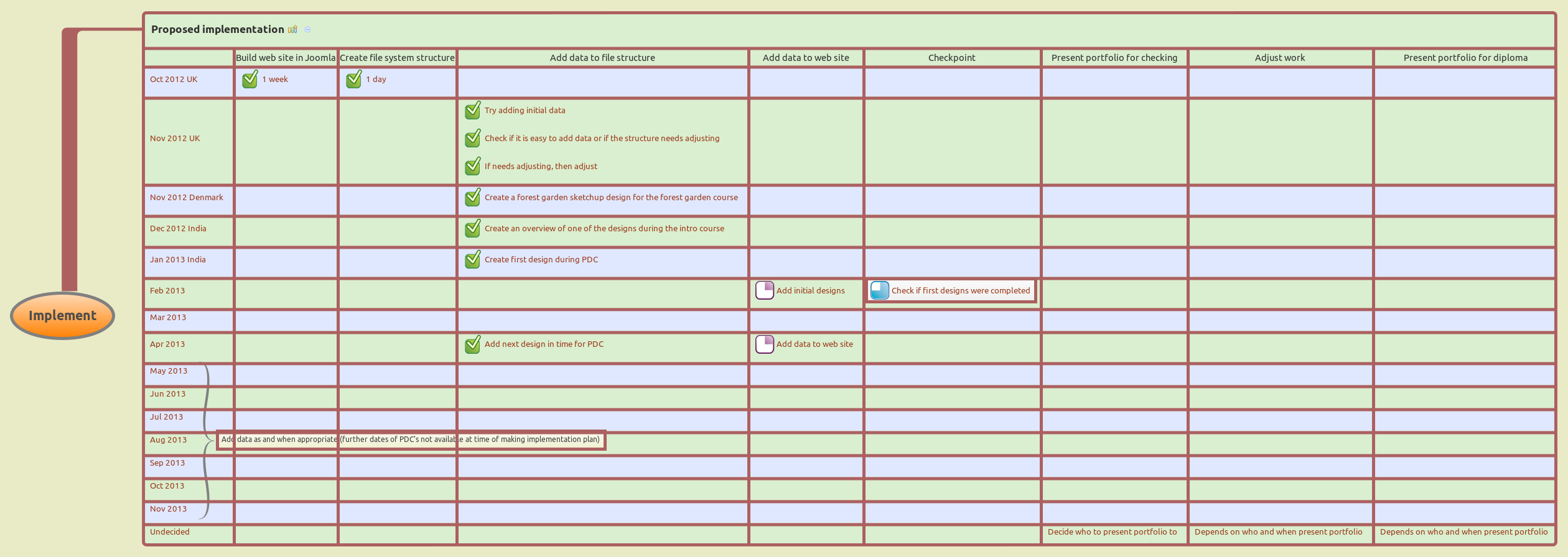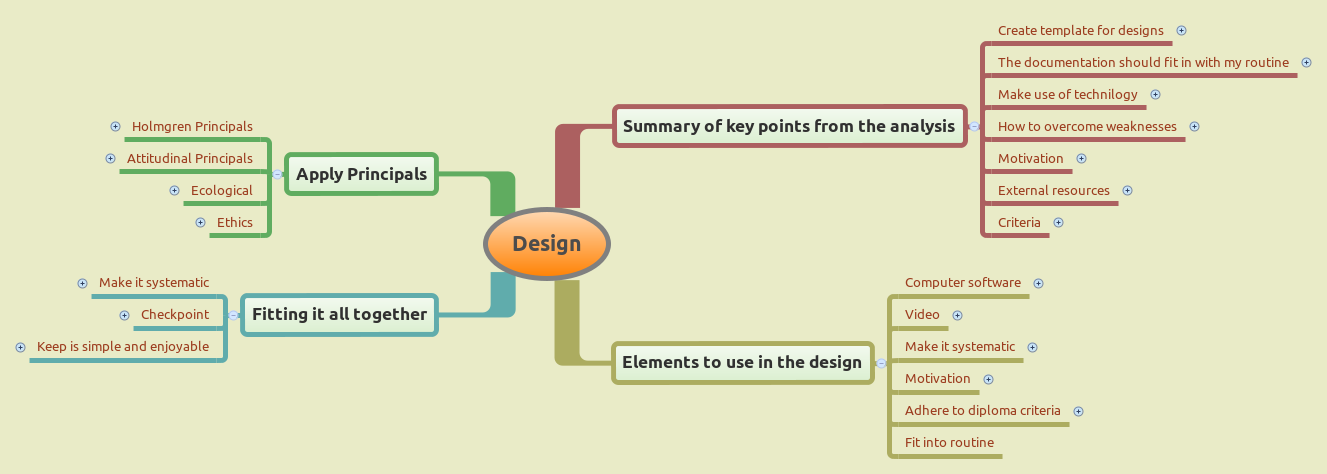 During the design phase, I keep a copy of the “Summary of keypoints” in full view which helps me to extract some of the key elements (both from the summary of keypoints as well as ideas that this stimulates). I then systematically go through the permaculture principles(Apply the permaculture principles), to see how each principle effects and helps me to think about the key elements. Any ideas that come to mind are then noted on the mind map. This may appear to be a linear process, but it is definitely not. As I go through the principles and as new ideas come to mind, I revisit areas I have already commented on and evolve the idea. This is for me is the clearest advantage of a mind map over writing down thoughts in a linear way, I can easily find new and interesting connections and go back to parts that I have covered again and again, so the whole design evolves together. I can then find connections, which help to make all the elements fit even better and make them more resilient.