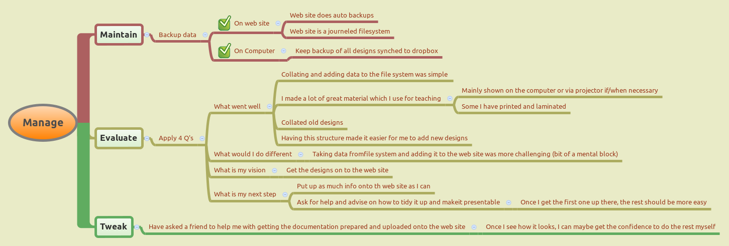 Working through the iterative design process, can be fun and very lively. But at some point you have to stop, conclude and prepare to make it happen. So I conclude the design phase by making a summary of the design. For example,in this case I conclude I need to make a file system structure, where I can drop existing information as well as new information into. But most importantly in order to make it realistic to implement, I keep in mind my main motivation is to inspire and educate. I also realise in order to keep the process on track I need to put in checkpoints, using SMARTER objectives, which I then place into my google calendar, so that I am reminded to review my objectives.