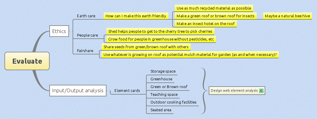 This simple mind map takes looks at the elements identified in survey and considers how the ethics of permaculture apply.