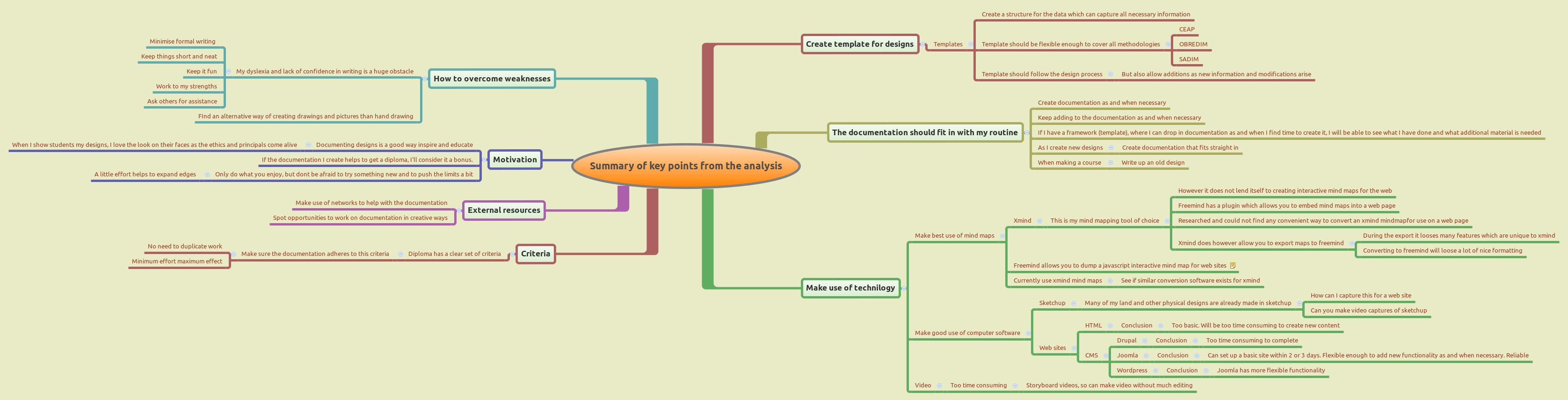 This section includes the detailed mind maps where I explore the analysis work. As in the survey section, I have included an explorable freemind mind map as well as a static image of the original xmind mind map. In the original xmind mind map you can see how I have taken information from the survey and added comments, which I have highlighted in yellow.