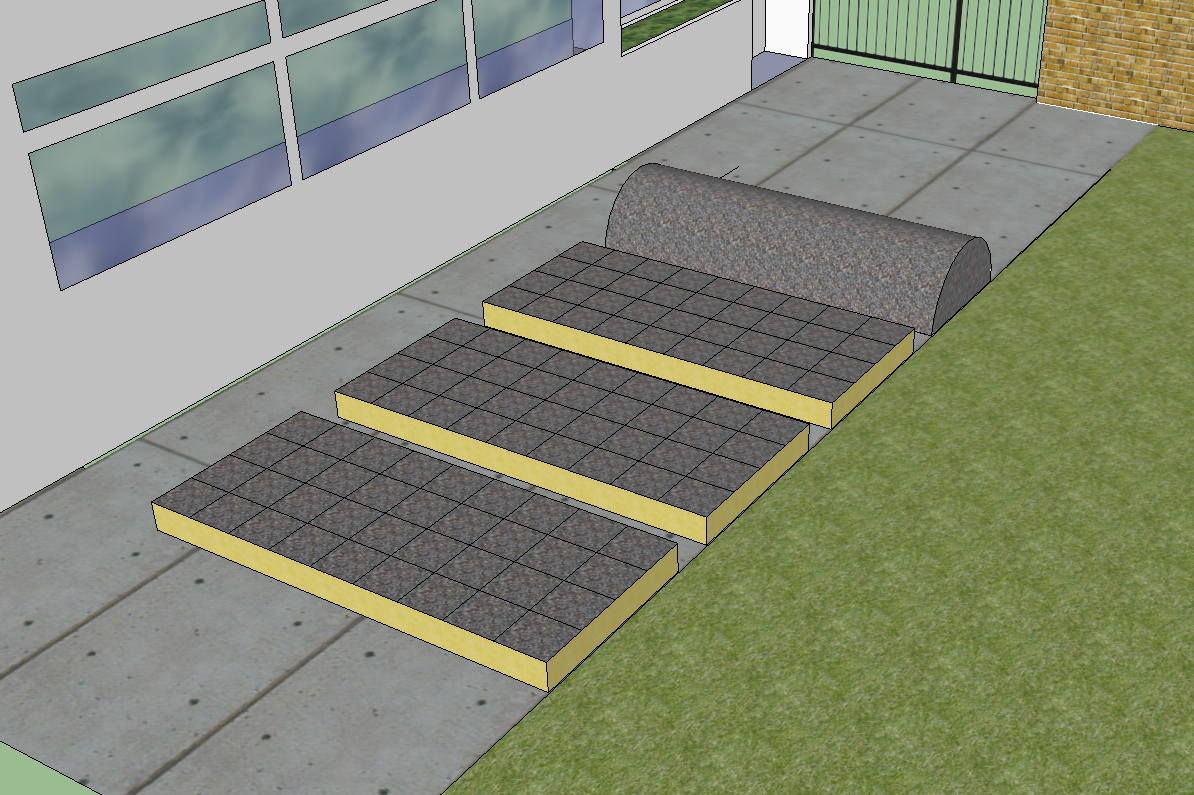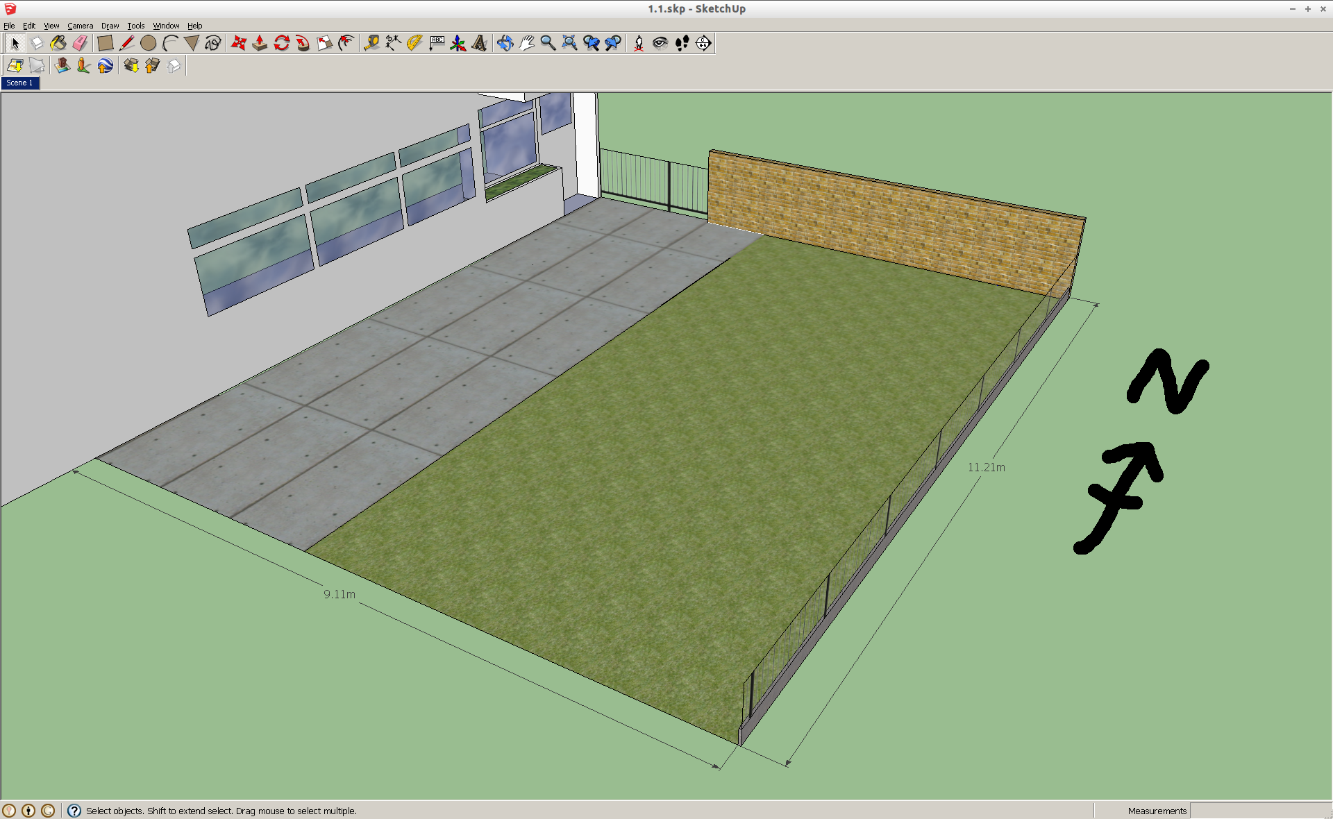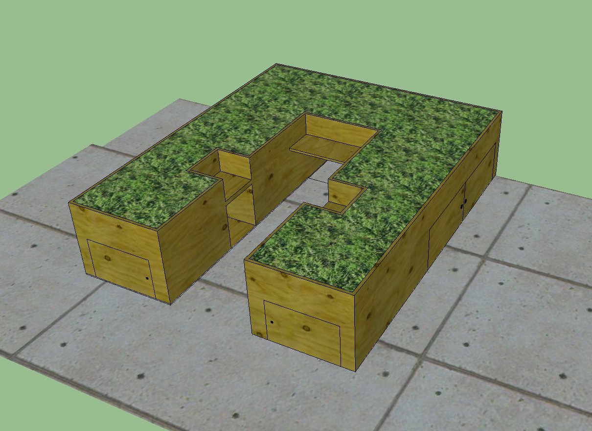 The next things we placed were the compost bins and cloche. The compost bin only had one realistic place to go, as they did not want the bins to be under the windows or near the door. Which left the length of the wall under the windows for a cloche. Running the design through the principles such as multiple elements multiple functions, we came to the conclusion of making it a cloche-cum-greenhouse-cum-table-cum-storage space. To facilitate this we designed how we can add glass to the frame (top and front) to make it a greenhouse, add remove either the lid or the front depending on how much sun and air we needed at different times of the year. We could also take both off so it could be used as a table. It was designed in such a way that we could do it section by section, so if at any one time we wanted some exposed, while others were covered we could easily do this. Underneath the table we made more storage space. The following picture does not show the full extent of the cloche design, as at this point we sketched out the pattern and later filled in the details (without updating the sketchup design).